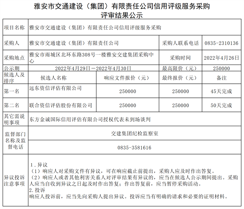 雅安市交通建设(集团)有限责任公司信用评级服务采购评审结果公示