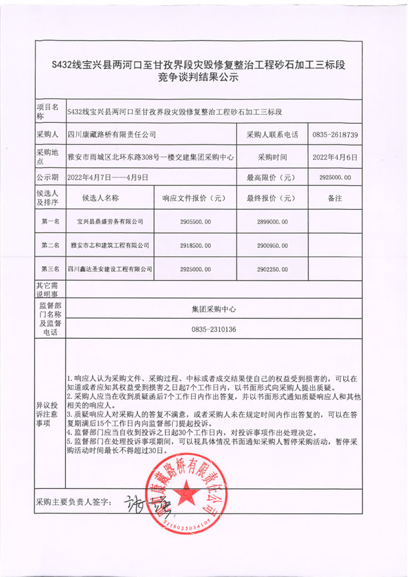 四川康藏路桥有限责任公司S432线宝兴县两河口至甘孜界段灾毁修复整治工程砂石加工三标段竞争谈判结果公示