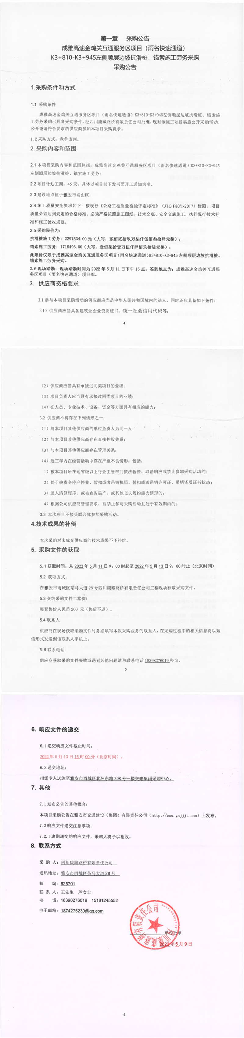 四川康藏路桥有限责任公司成雅高速金鸡关互通服务区项目(雨名快速通道)K3+810-K3+945左侧顺层边坡抗滑桩、锚索施工劳务采购采购公告