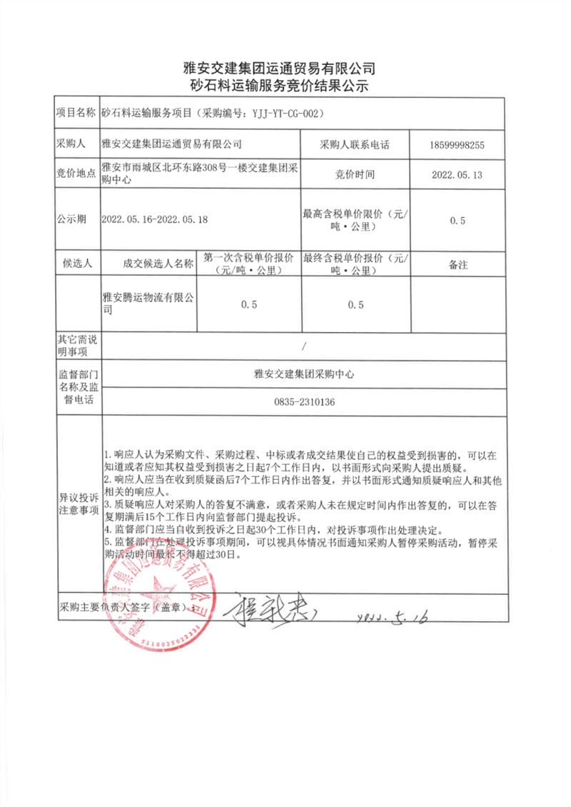 四川康藏路桥有限责任公司成雅高速金鸡关互通及服务区项目(雨名快速通道)TJ2标段沥青混凝土采购竞争谈判结果公示