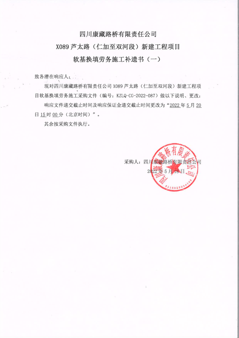 四川康藏路桥有限责任公司X089芦太路(仁加至双河段)新建工程项目软基换填劳务施工补遗书(一)
