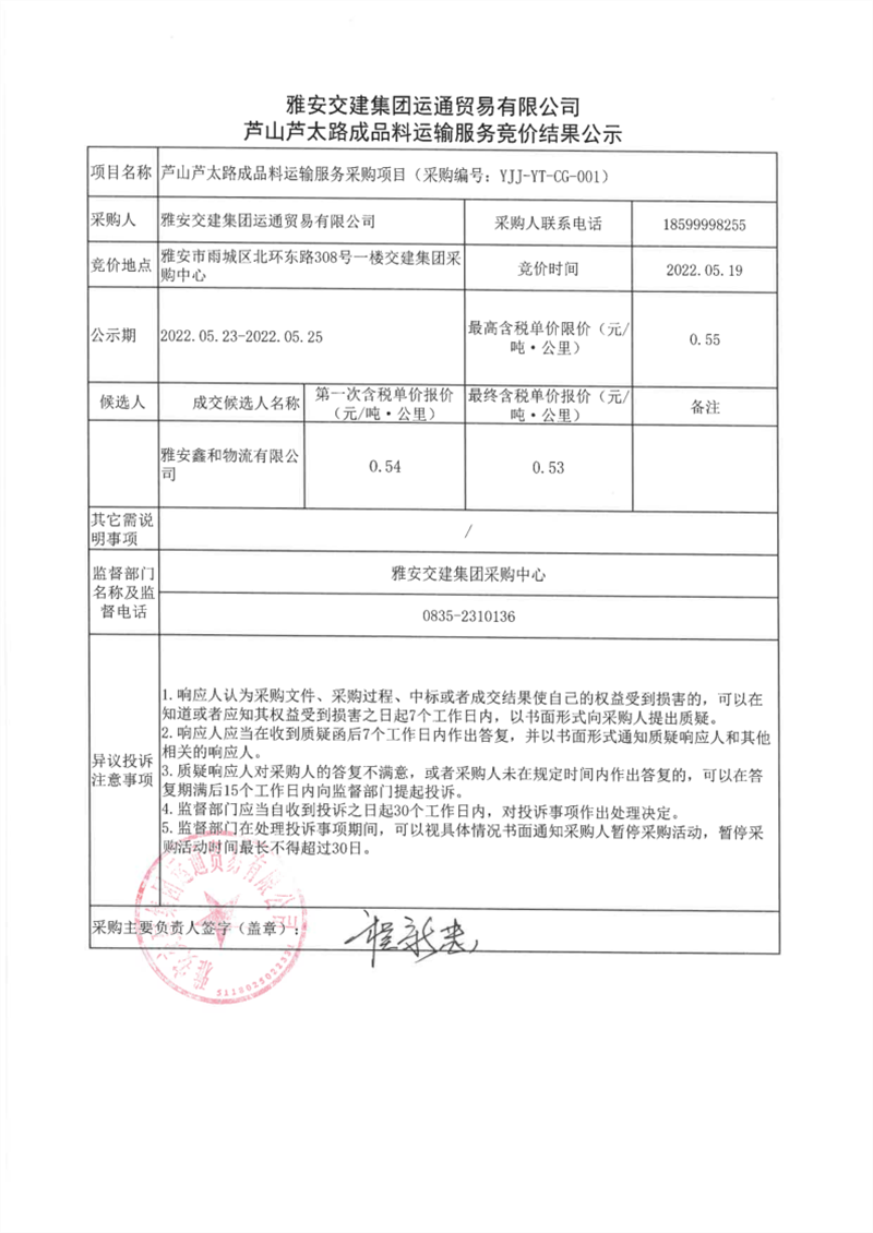 DB视讯 集团运通贸易有限公司芦山芦太路成品料运输服务竞价结果公示
