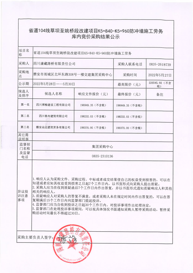 四川康藏路桥有限责任公司省道104线草坝至姚桥段改建项目K5+840-K5+960防冲墙施工劳务库内竞价采购结果公示