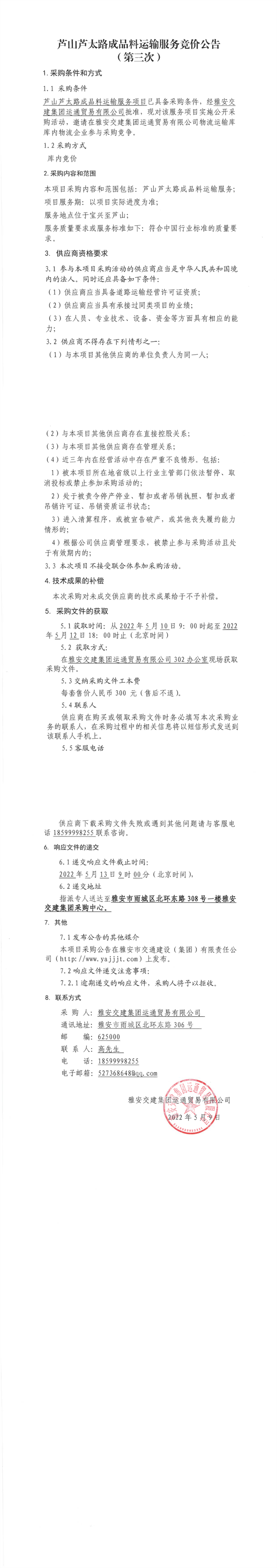 DB视讯 集团运通贸易有限公司芦山芦太路成品料运输服务竞价公告(第三次)