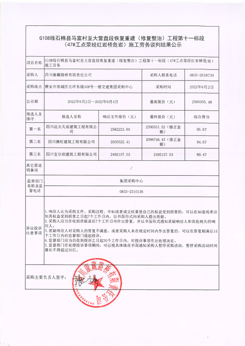 四川康藏路桥有限责任公司G108线石棉县马富村至大营盘段恢复重建(修复整治)工程第十一标段(47#工点荥经红岩桥危岩)施工劳务谈判结果公示