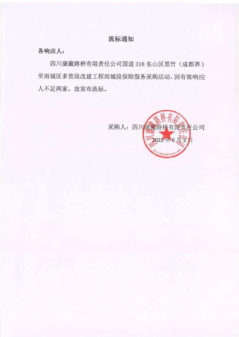 四川康藏路桥有限责任公司国道318名山区黑竹(成都界)至雨城区多营段改建工程雨城段保险服务采购流标通知