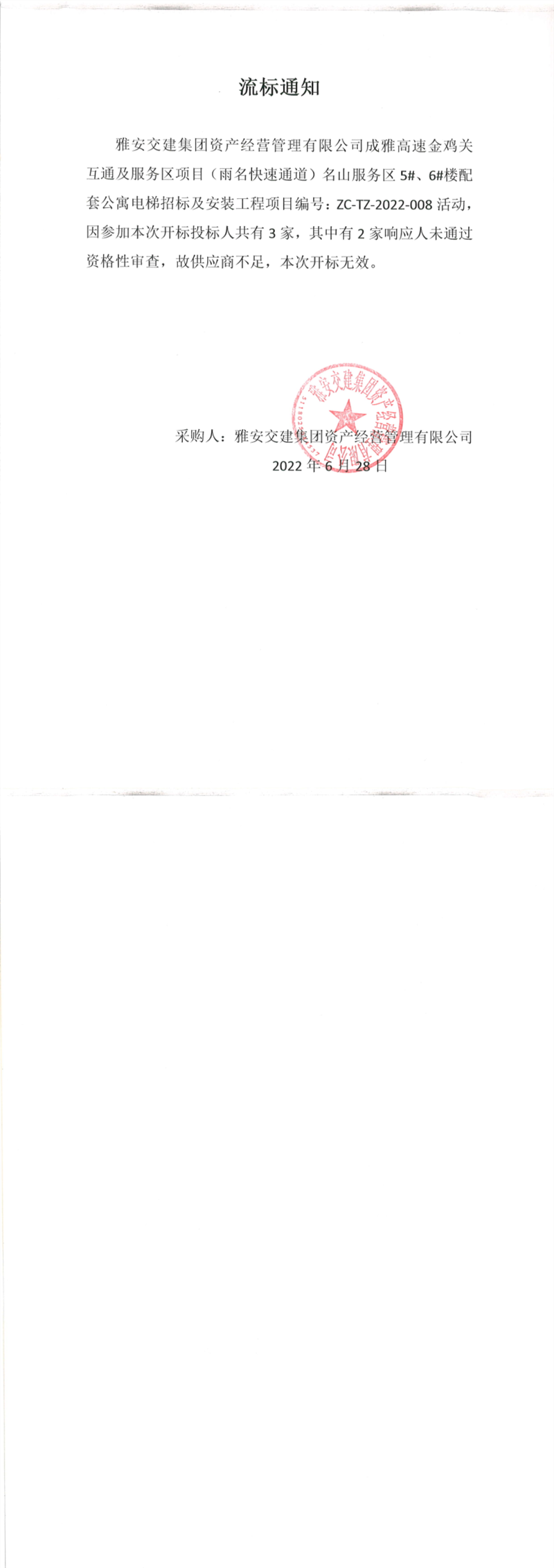DB视讯 集团资产经营管理有限公司成雅高速金鸡关互通及服务区(雨名快速通道)名山服务区5#、6#楼配套公寓电梯招标及安装工程项目流标通知