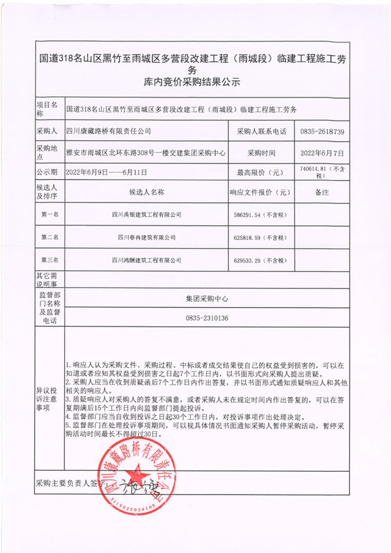 四川康藏路桥有限责任公司国道318名山区黑竹至雨城区多营段改建工程(雨城段)临建工程施工劳务库内竞价采购结果公示
