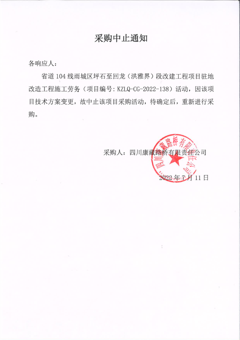 四川康藏路桥有限责任公司省道104线雨城区坪石至回龙(洪雅界)段改建工程项目驻地改造工程施工劳务采购中止通知