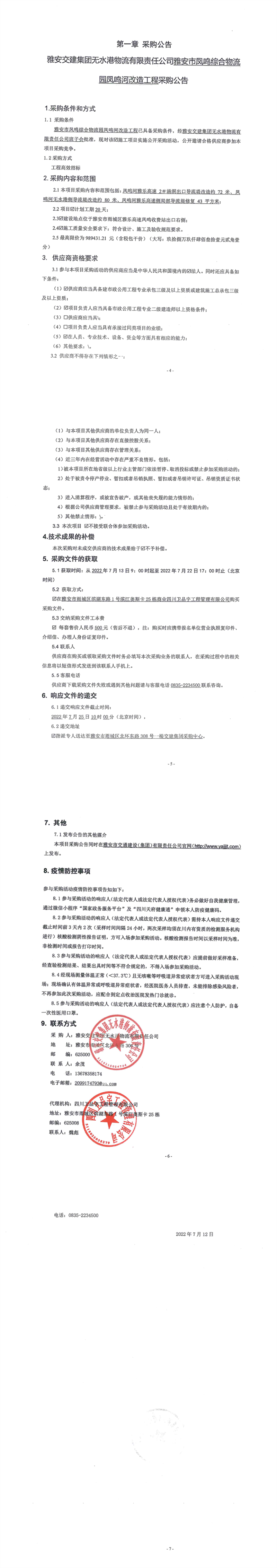 DB视讯 集团无水港物流有限责任公司雅安市凤鸣综合物流园凤鸣河改造工程采购公告