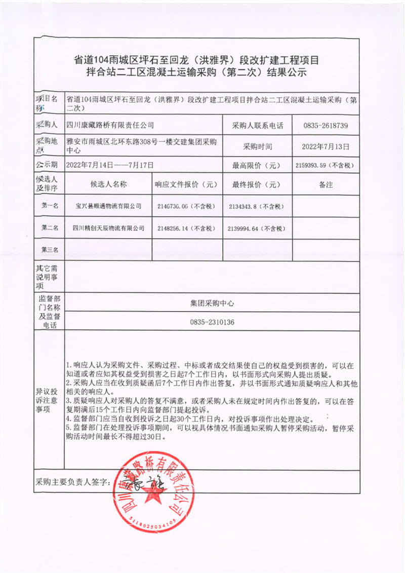 四川康藏路桥有限责任公司省道104线雨城区坪石至回龙(洪雅界)段改扩建工程项目拌合站二工区混凝土运输采购(第二次)结果公示