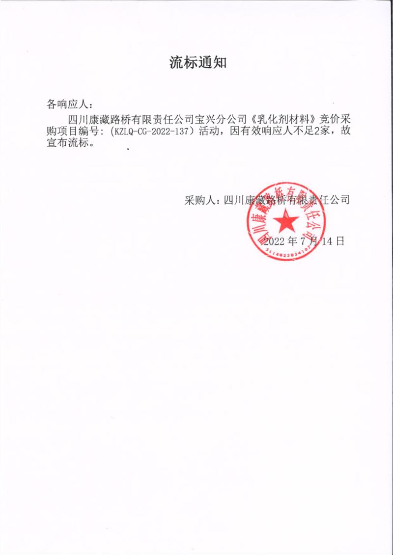 四川康藏路桥有限责任公司宝兴分公司乳化剂材料采购流标通知