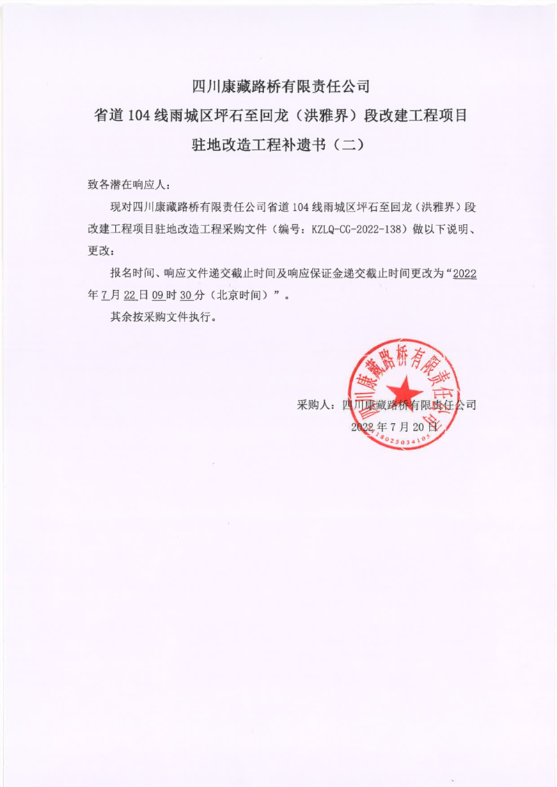 四川康藏路桥有限责任公司省道104线雨城区坪石至回龙(洪雅界)段改建工程项目驻地改造工程补遗书(二)