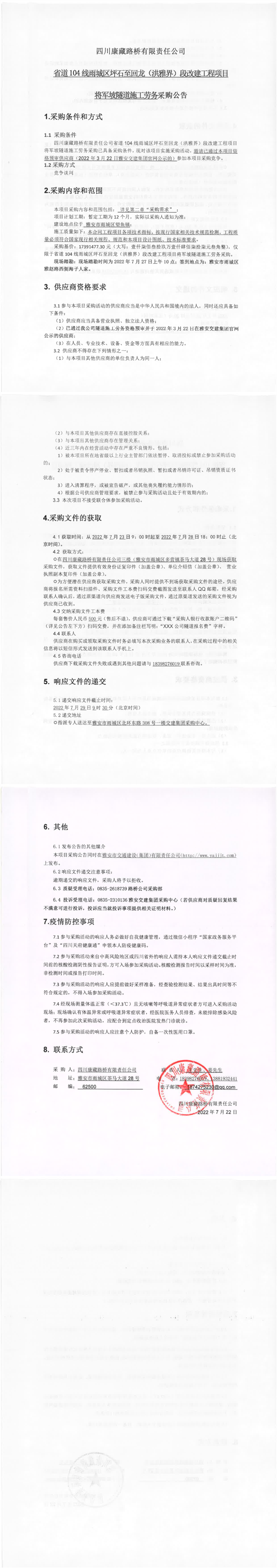 四川康藏路桥有限责任公司省道104线雨城区坪石至回龙(洪雅界)段改建工程项目将军坡隧道施工劳务采购公告