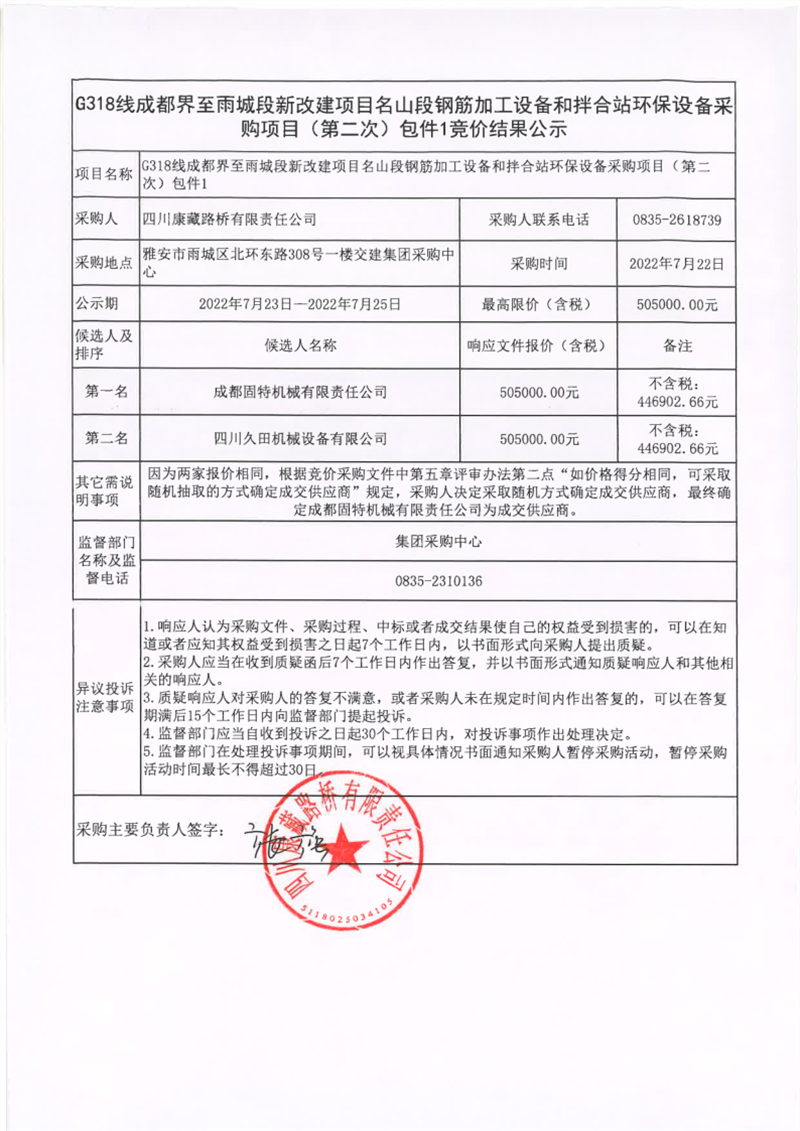 四川康藏路桥有限责任公司G318线成都界至雨城段新改建项目名山段钢筋加工设备和拌合站环保设备采购项目(第二次)包件1竞价结果公示