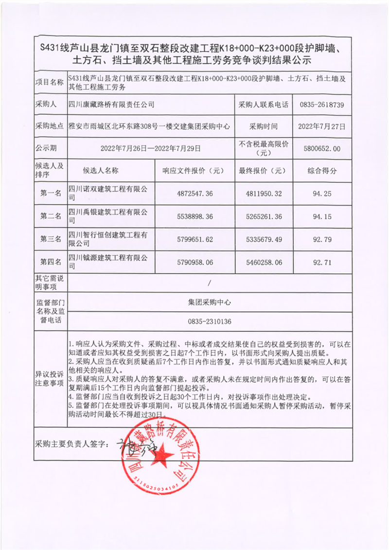 四川康藏路桥有限责任公司S431线芦山县龙门镇至双石整段改建工程K18+000-K23+000段护脚墙、土方石、挡土墙及其他工程施工劳务竞争谈判结果公示