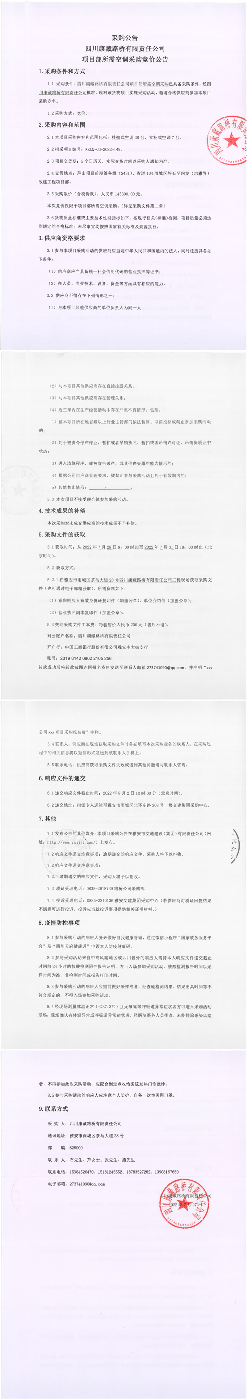 四川康藏路桥有限责任公司项目部所需空调采购竞价公告