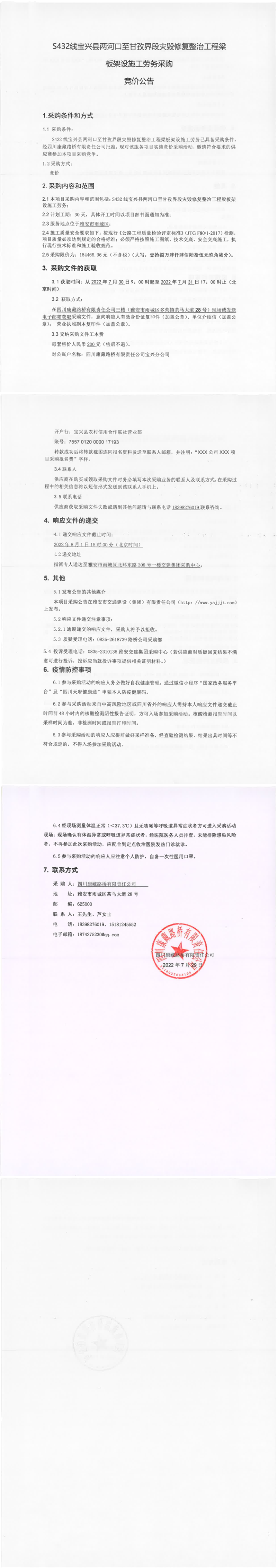 四川康藏路桥有限责任公司S432线宝兴县两河口至甘孜界段灾毁修复整治工程梁板架设施工劳务采购竞价公告