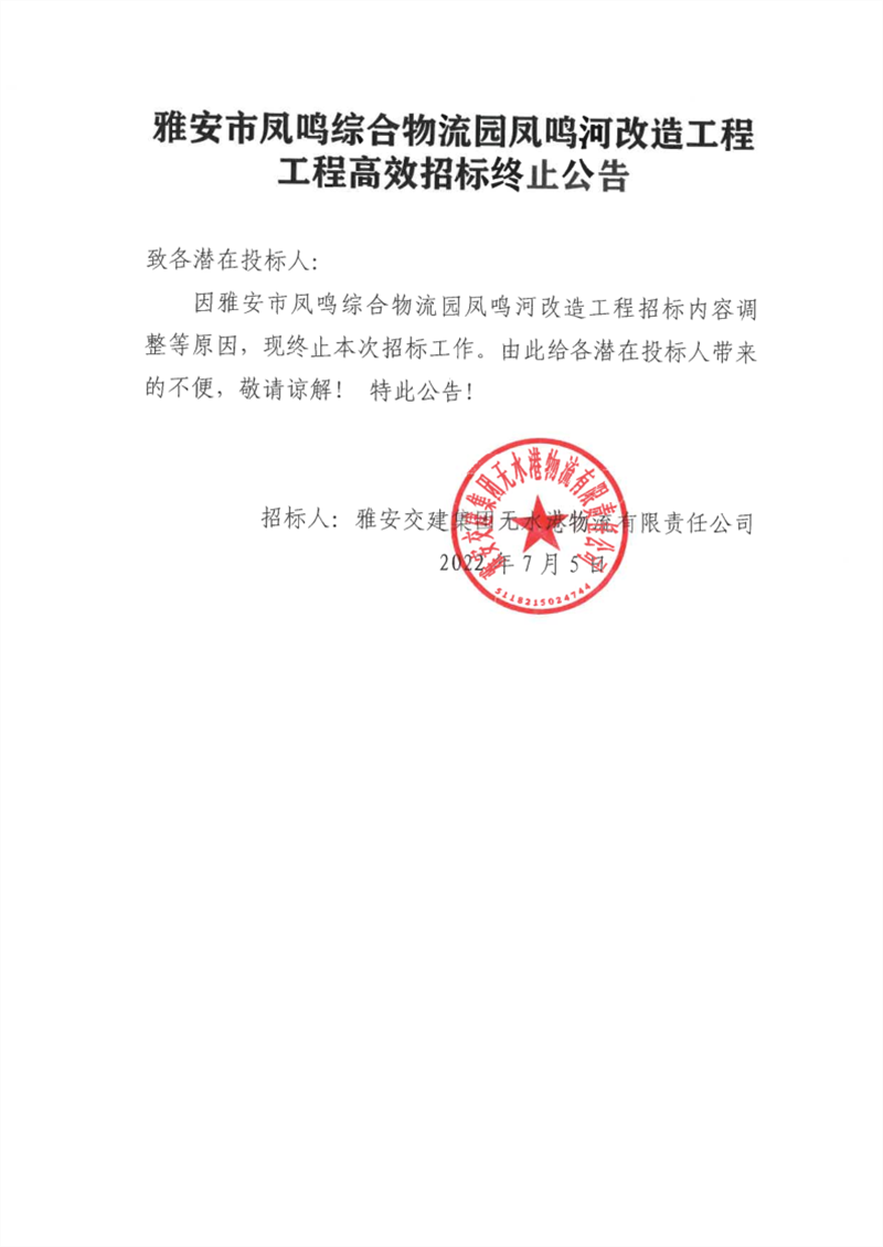 DB视讯 集团无水港物流有限责任公司雅安市凤鸣综合物流园凤鸣河改造工程高效招标终止公告