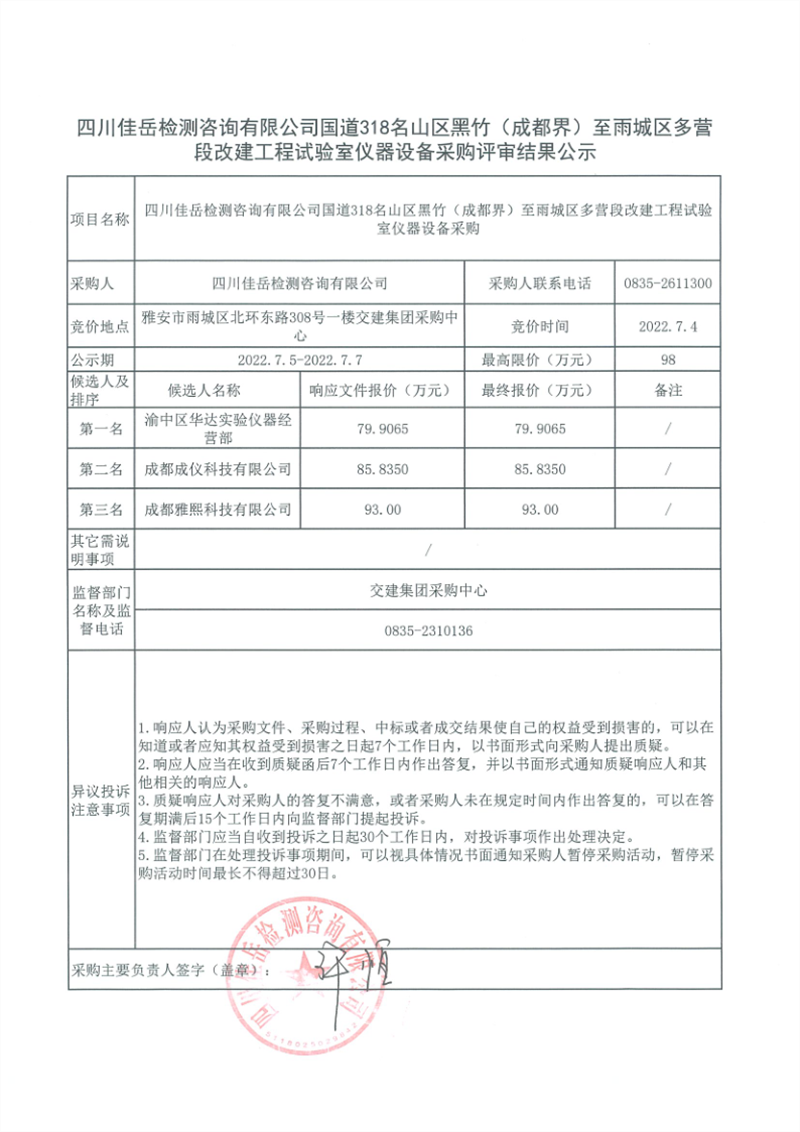 四川佳岳检测咨询有限公司国道318名山区黑竹(成都界)至雨城区多营段改建工程试验室仪器设备采购评审结果公示