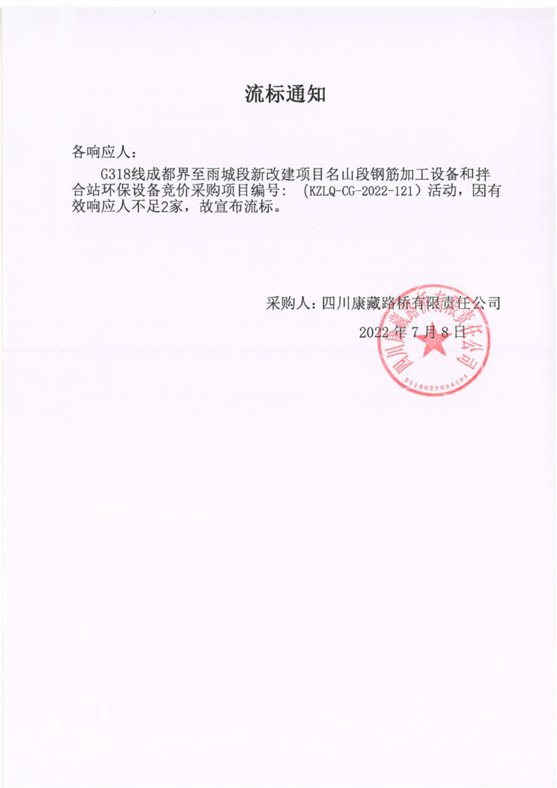 四川康藏路桥有限责任公司G318线成都界至雨城段新改建项目名山段钢筋加工设备和拌合站环保设备竞价采购项目流标通知