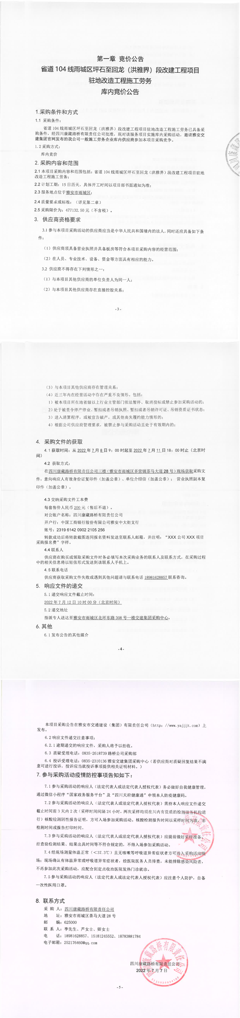四川康藏路桥有限责任公司省道104线雨城区坪石至回龙(洪雅界)段改建工程项目驻地改造工程施工劳务库内竞价公告