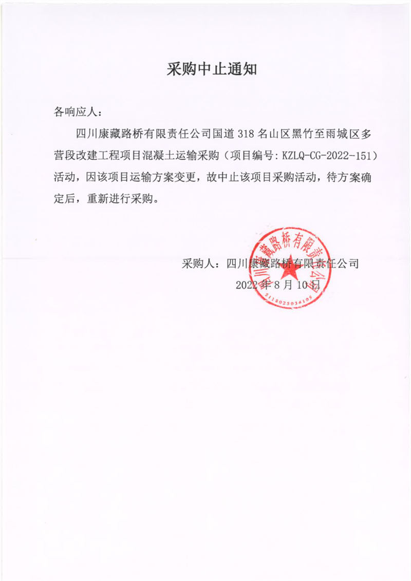 四川康藏路桥有限责任公司国道318名山区黑竹至雨城区多营段改建工程项目混凝土运输采购中止通知