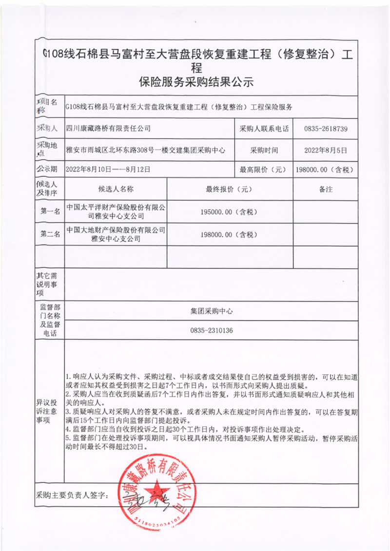 四川康藏路桥有限责任公司G108线石棉县马富村至大营盘段恢复重建工程(修复整治)工程保险服务采购结果公示