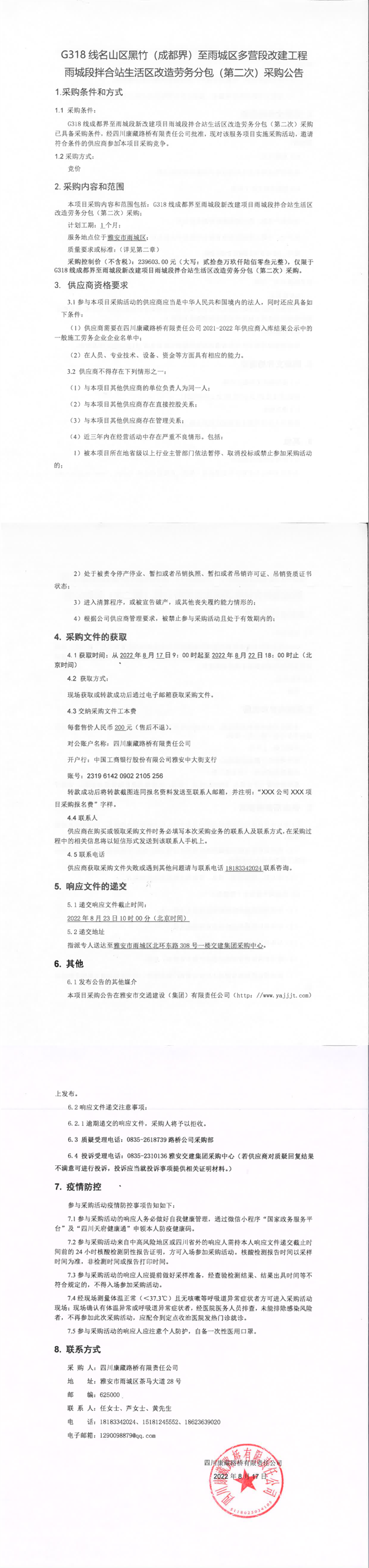四川康藏路桥有限责任公司G318线名山区黑竹(成都界)至雨城区多营段改建工程雨城段拌合站生活区改造劳务分包(第二次)采购公告
