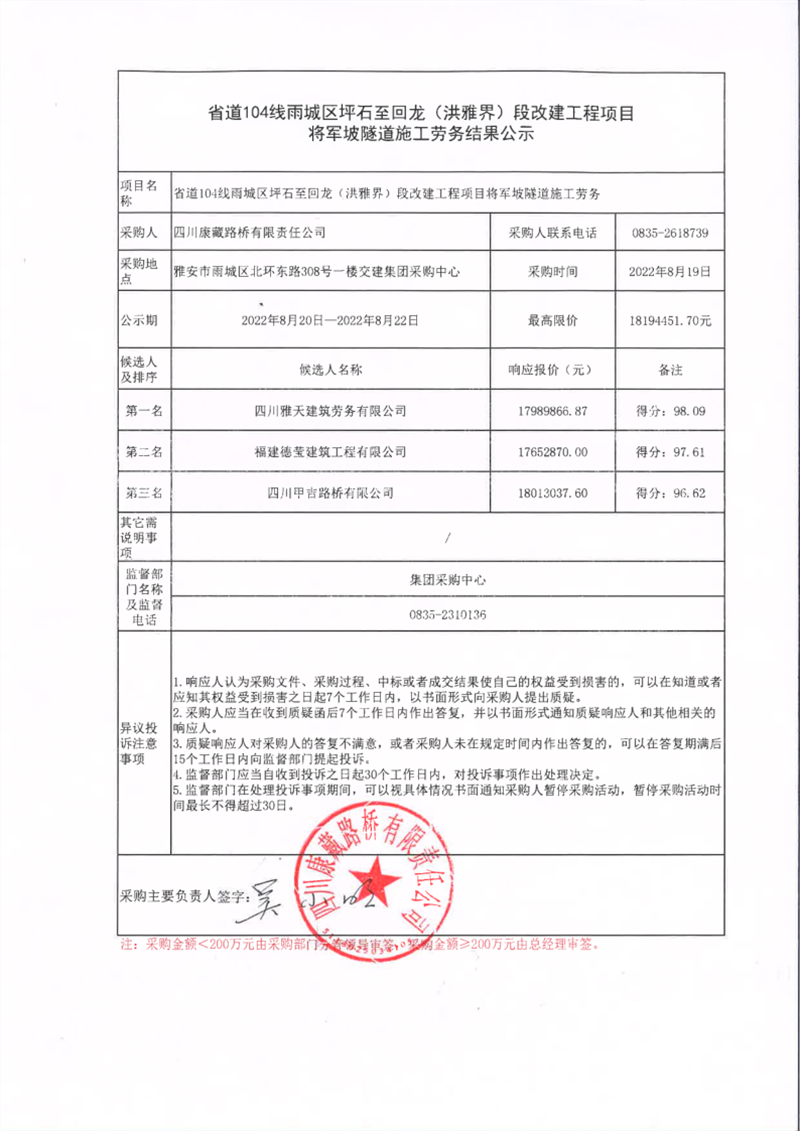 四川康藏路桥有限责任公司省道104线雨城区坪石至回龙(洪雅界)段改建工程项目将军坡隧道施工劳务结果公示