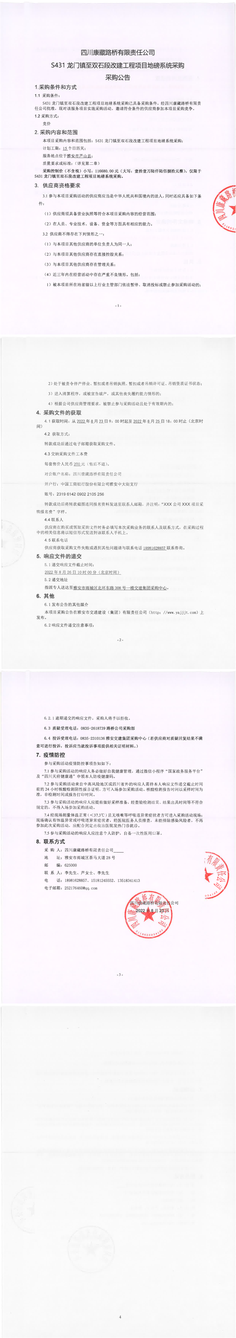 四川康藏路桥有限责任公司S431龙门镇至双石段改建工程项目地磅系统采购采购公告