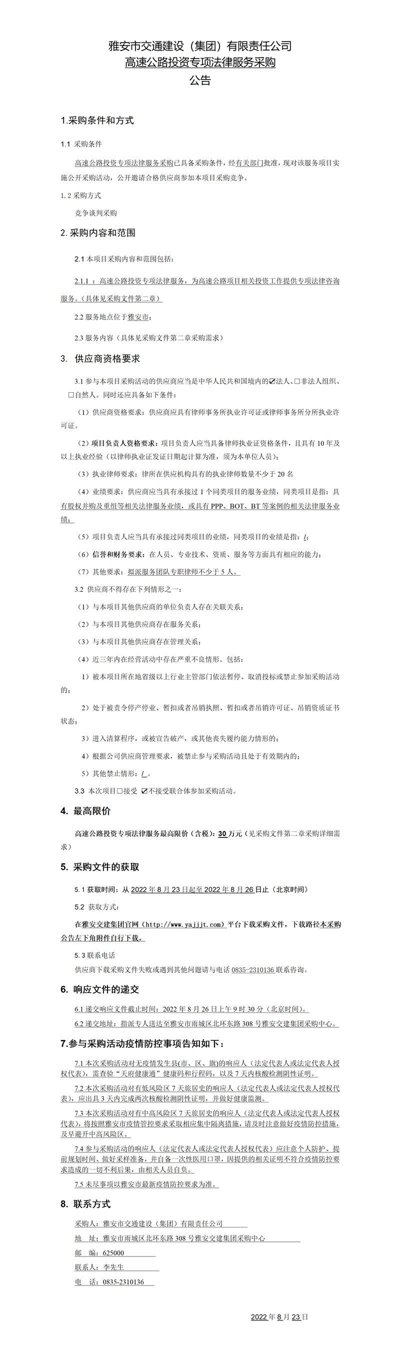 雅安市交通建设(集团)有限责任公司高速公路投资专项法律服务采购公告