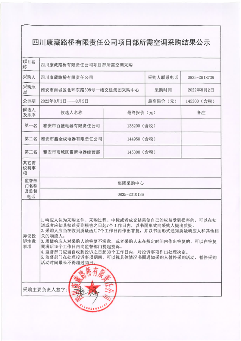 四川康藏路桥有限责任公司项目部所需空调采购结果公示