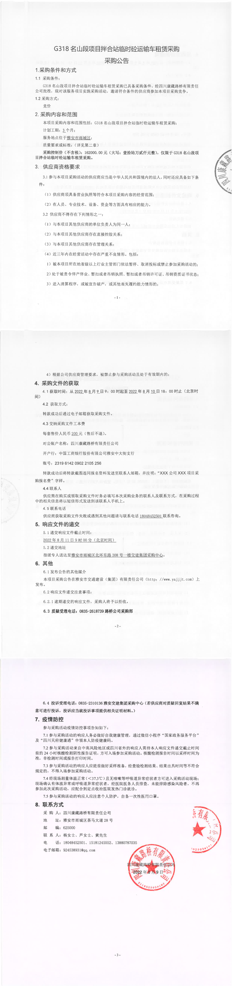 四川康藏路桥有限责任公司G318名山段项目拌合站临时砼运输车租赁采购采购公告