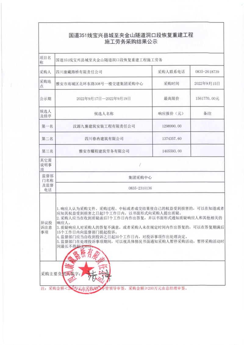 四川康藏路桥有限责任公司国道351线宝兴县城至夹金山隧道洞口段恢复重建工程施工劳务采购结果公示