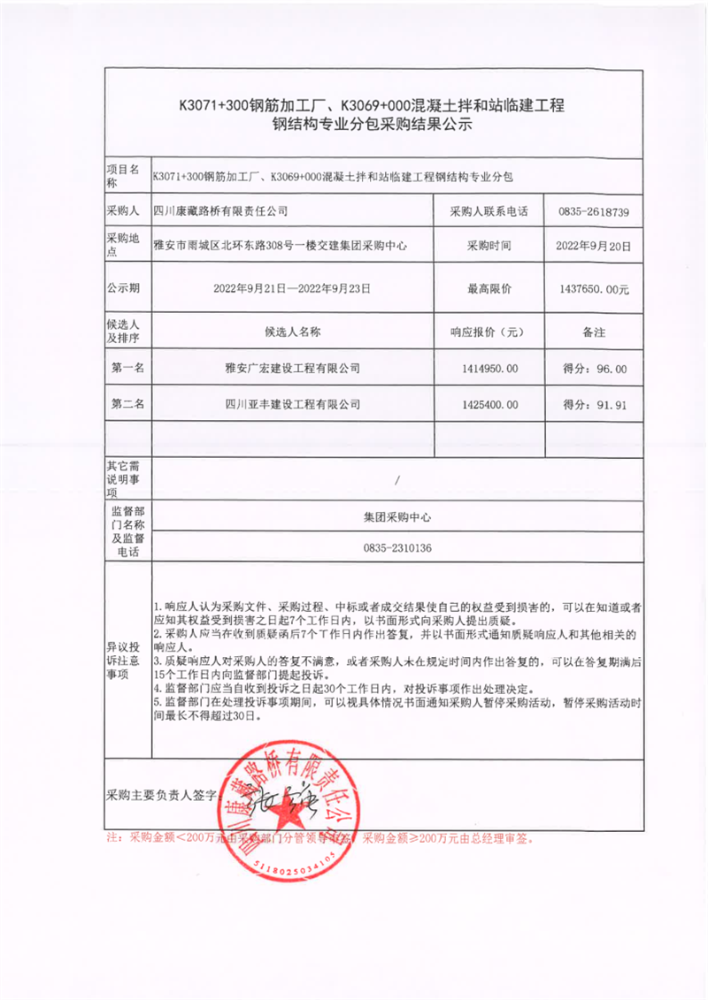 四川康藏路桥有限责任公司K3071+300钢筋加工厂、K3069+000混凝土拌和站临建工程钢结构专业分包采购结果公示