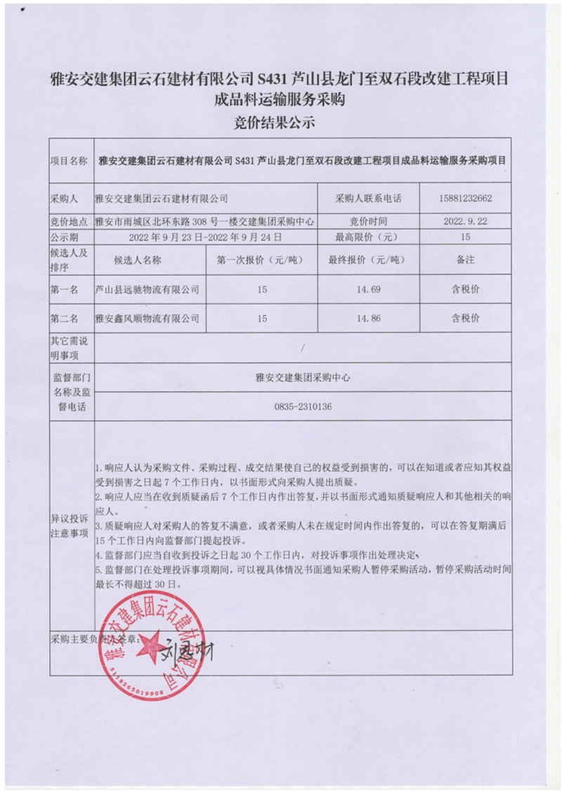 DB视讯 集团云石建材有限公司S431芦山县龙门至双石段改建工程项目成品料运输服务采购竞价结果公示