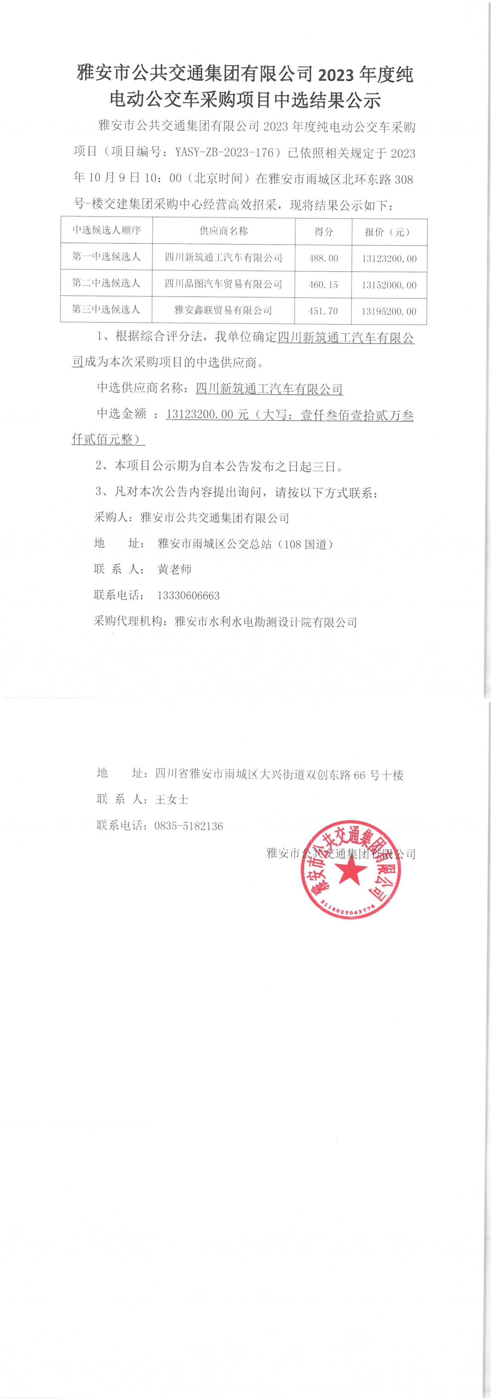 雅安市公共交通集团有限公司2023年度纯电动公交车采购项目中选结果公示