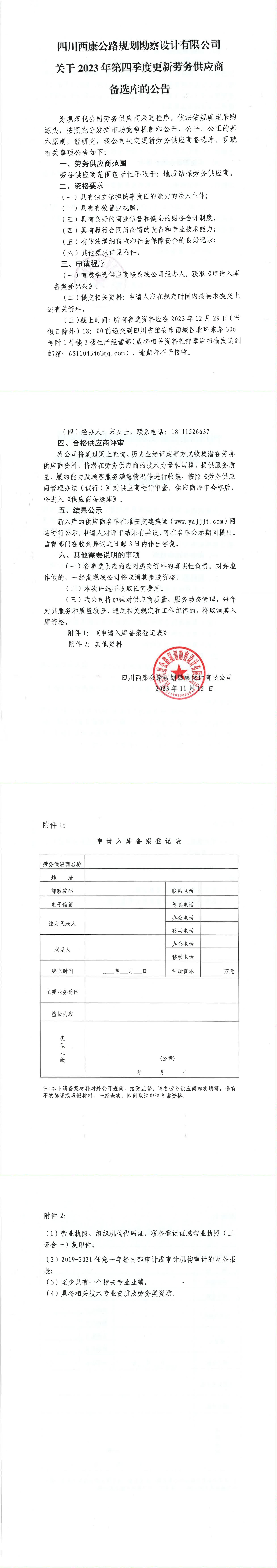 四川西康公路规划勘察设计有限公司关于2023年第四季度更新劳务供应商备选库的公告