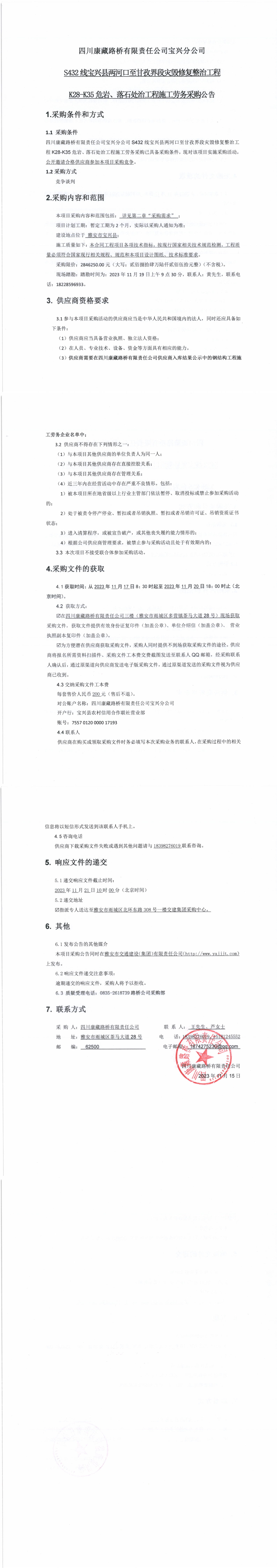 四川康藏路桥有限责任公司宝兴分公司S432线宝兴县两河口至甘孜界段灾毁修复整治工程K28-K35危岩、落石处治工程施工劳务采购公告