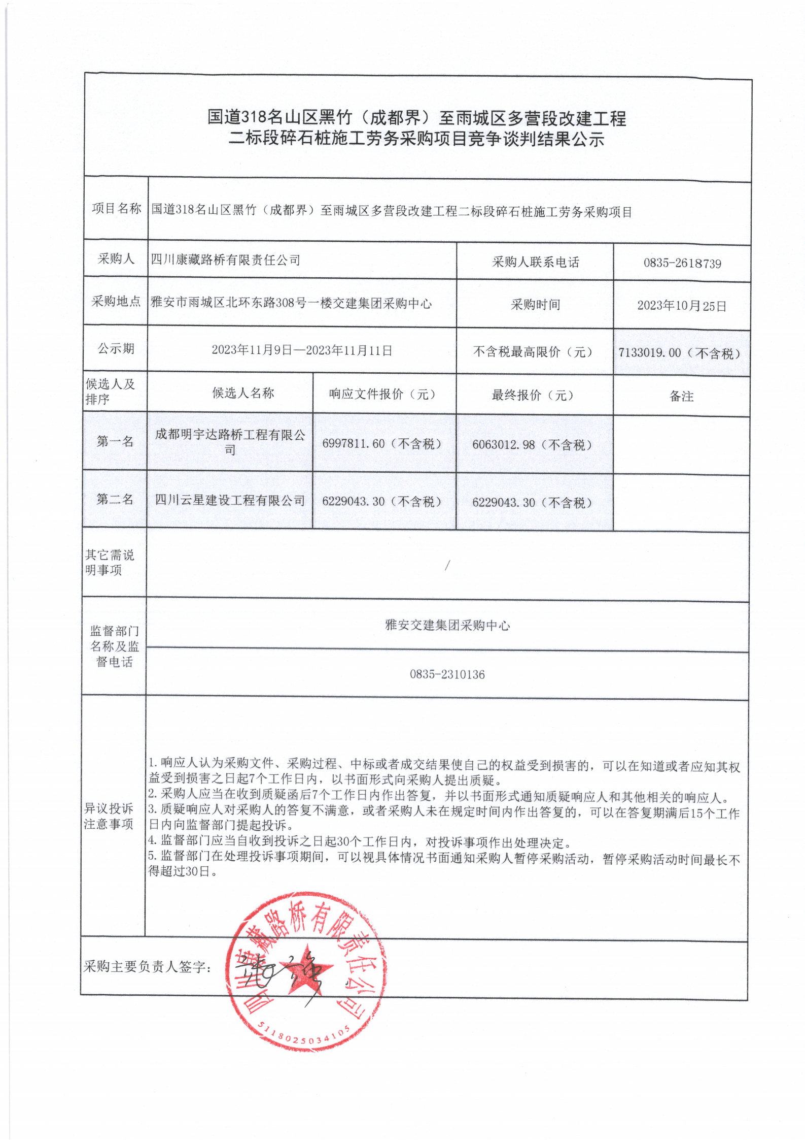 四川康藏路桥有限责任公司国道318名山区黑竹(成都界)至雨城区多营段改建工程二标段碎石桩施工劳务采购项目竞争谈判结果公示