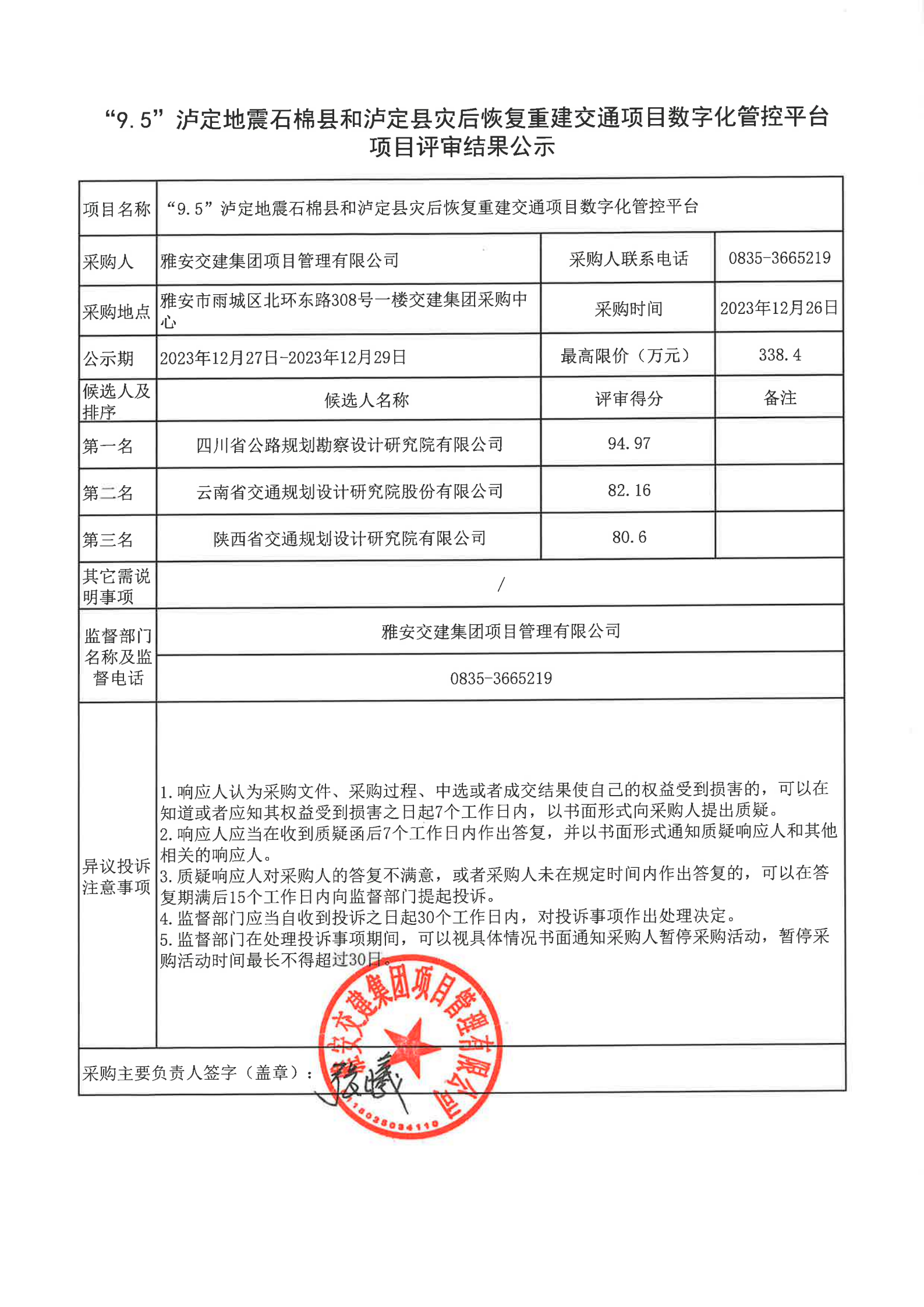 DB视讯 集团项目管理有限公司“9.5”泸定地震石棉县和泸定县灾后恢复重建交通项目数字化管控平台项目评审结果公示