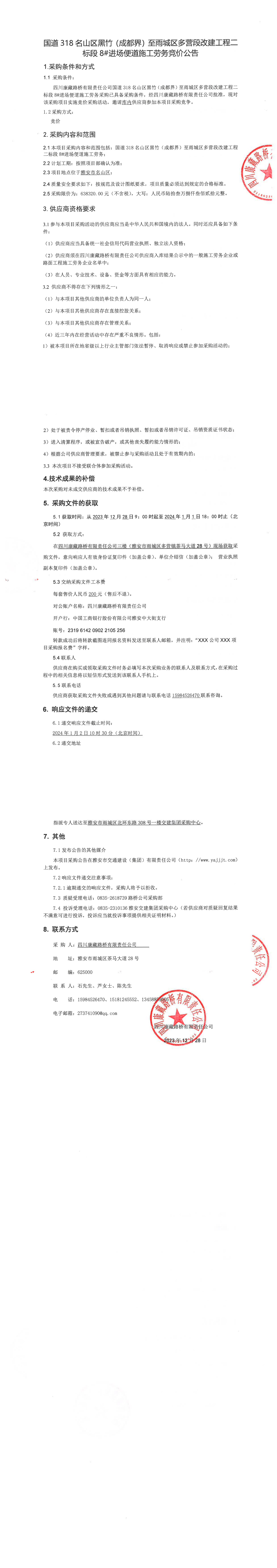 四川康藏路桥有限责任公司国道318名山区黑竹(成都界)至雨城区多营段改建工程二标段8#进场便道施工劳务竞价公告