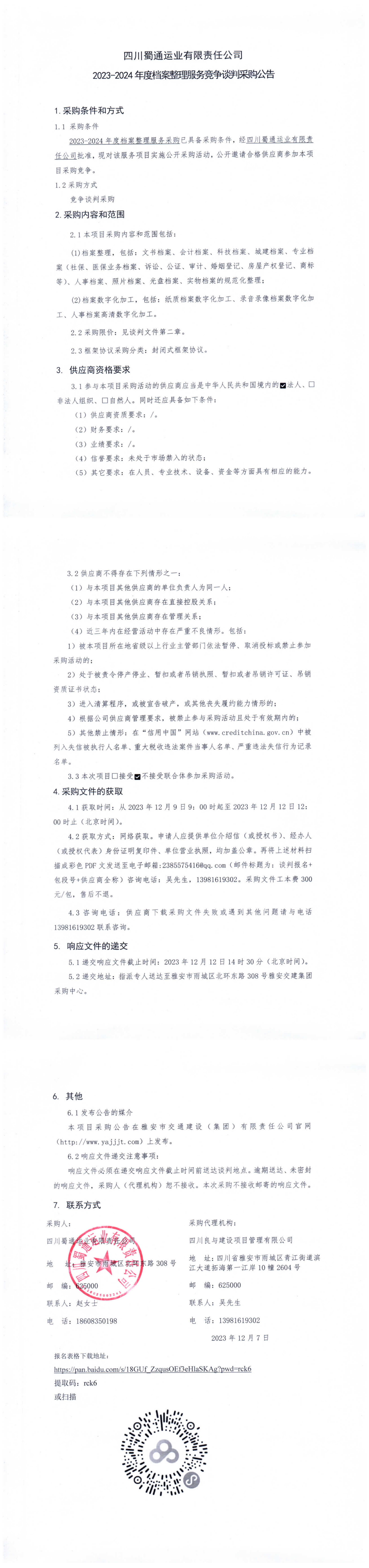 四川蜀通运业有限责任公司2023-2024年度档案整理服务竞争谈判采购公告