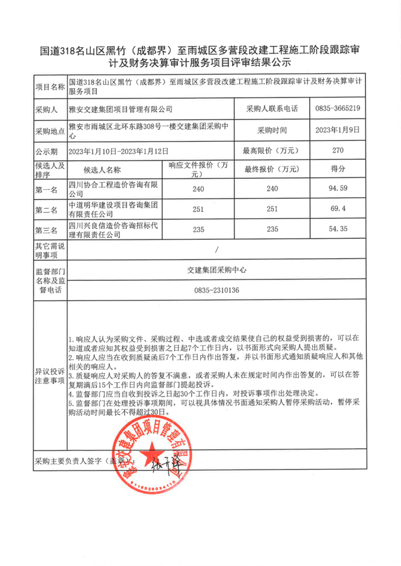 DB视讯 集团项目管理有限公司国道318名山区黑竹(成都界)至雨城区多营段改建工程施工阶段跟踪审计及财务决算审计服务项目评审结果公示