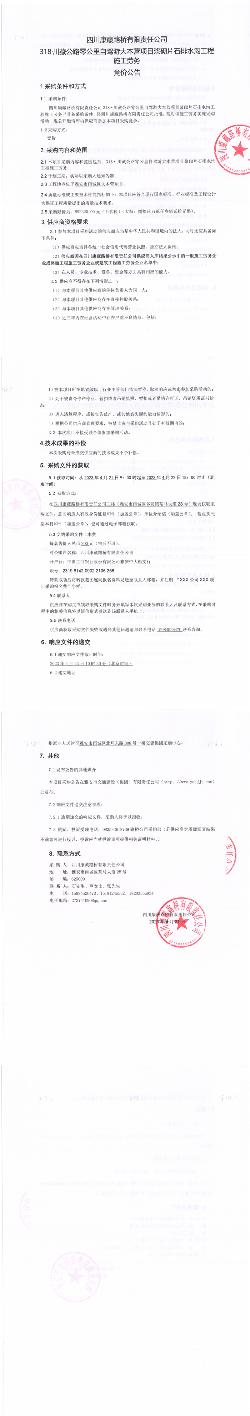 四川康藏路桥有限责任公司318·川藏公路零公里自驾游大本营项目浆砌片石排水沟工程施工劳务公告