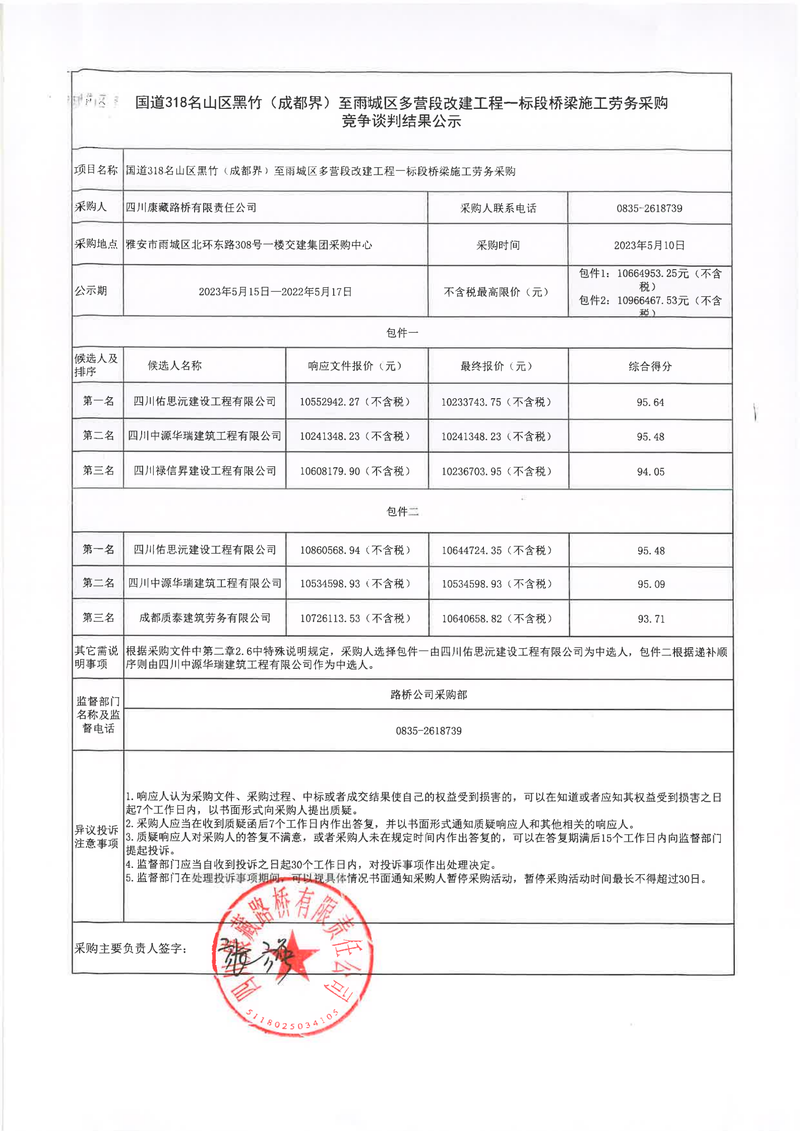 四川康藏路桥有限责任公司国道318名山区黑竹(成都界)雨城区多营段改建工程一标段桥梁施工劳务采购竞争谈判结果公示