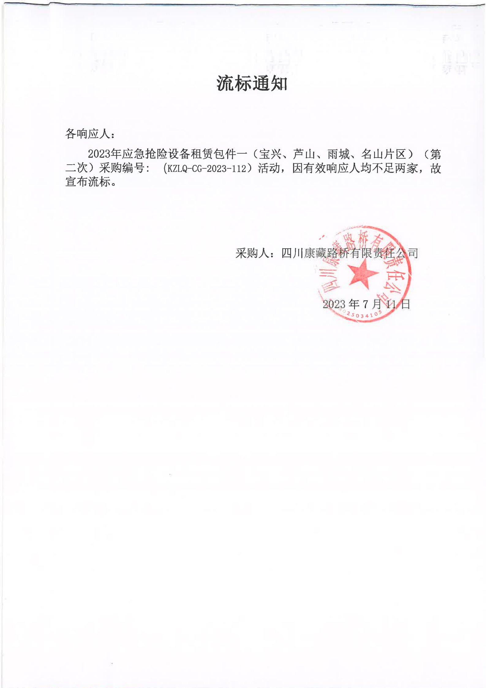 四川康藏路桥有限责任公司2023年应急抢险设备租赁包件一(宝兴、芦山、雨城、名山片区)(第二次)流标通知
