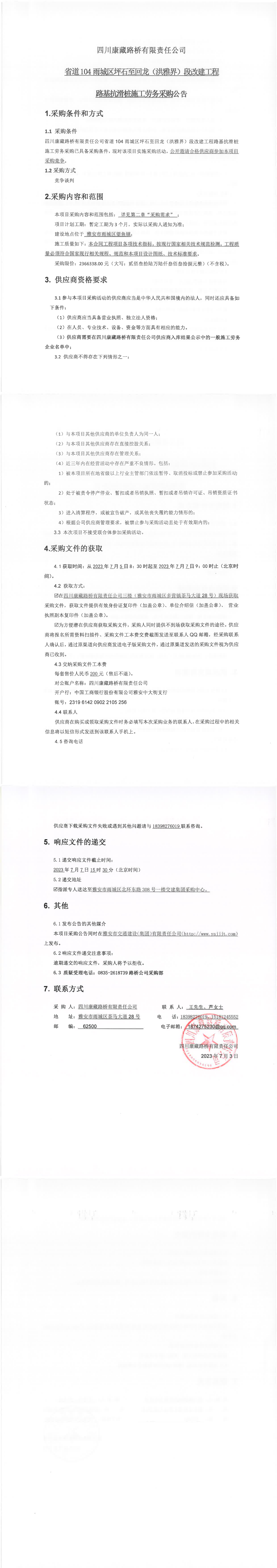 四川康藏路桥有限责任公司省道104雨城区坪石至回龙(洪雅界)段改建工程路基抗滑桩施工劳务采购公告