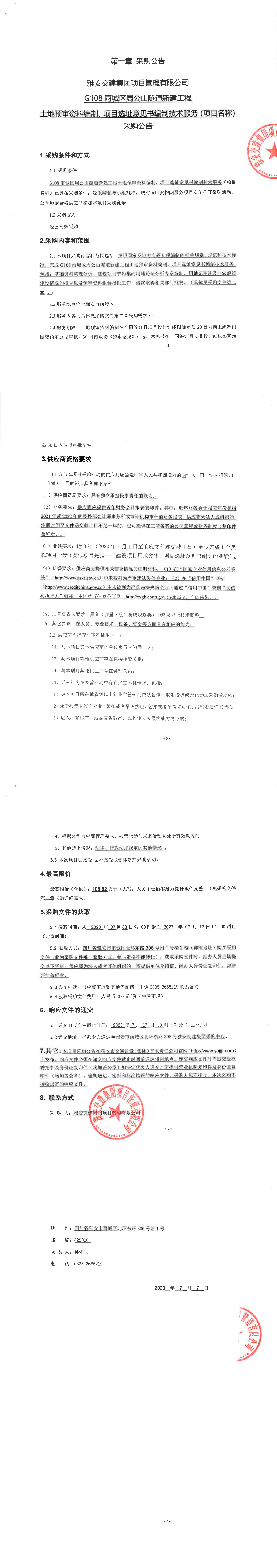 DB视讯 集团项目管理有限公司G108雨城区周公山隧道新建工程土地预审资料编制、项目选址意见书编制技术服务(项目名称)采购公告